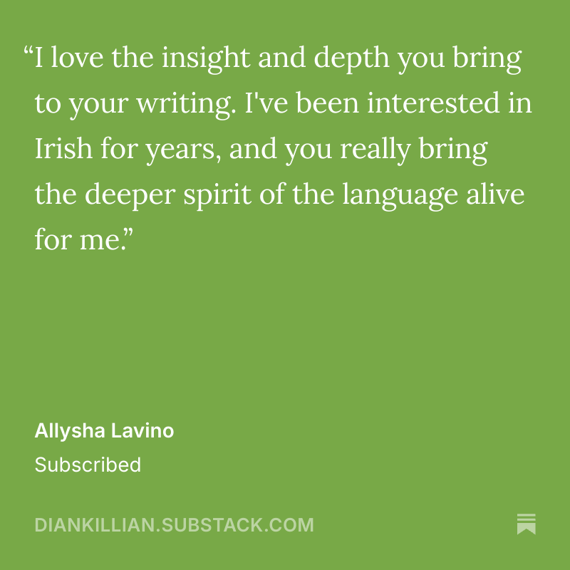 The Irish language continues to surprise, inspire and delight me. She is currently my greatest teacher, showing me what we humans see in the world—and don’t. I hope you will join me and this growing, visionary community at The Gaelic Effect.